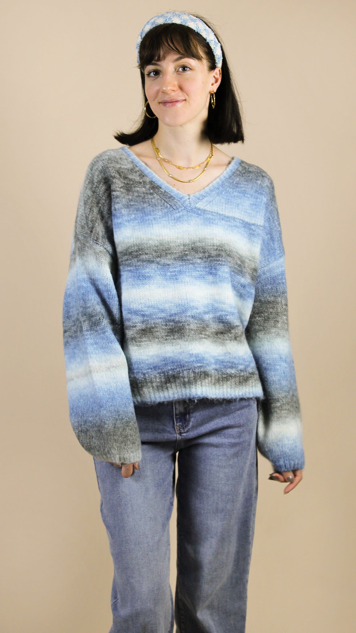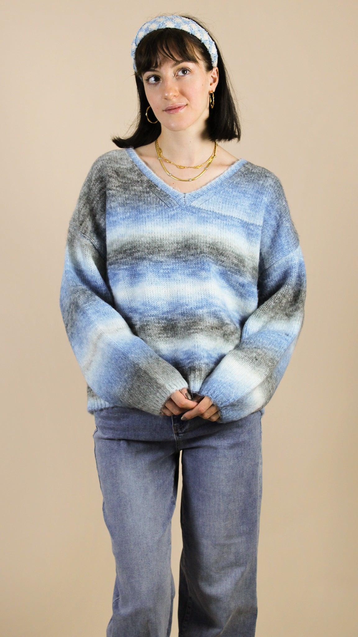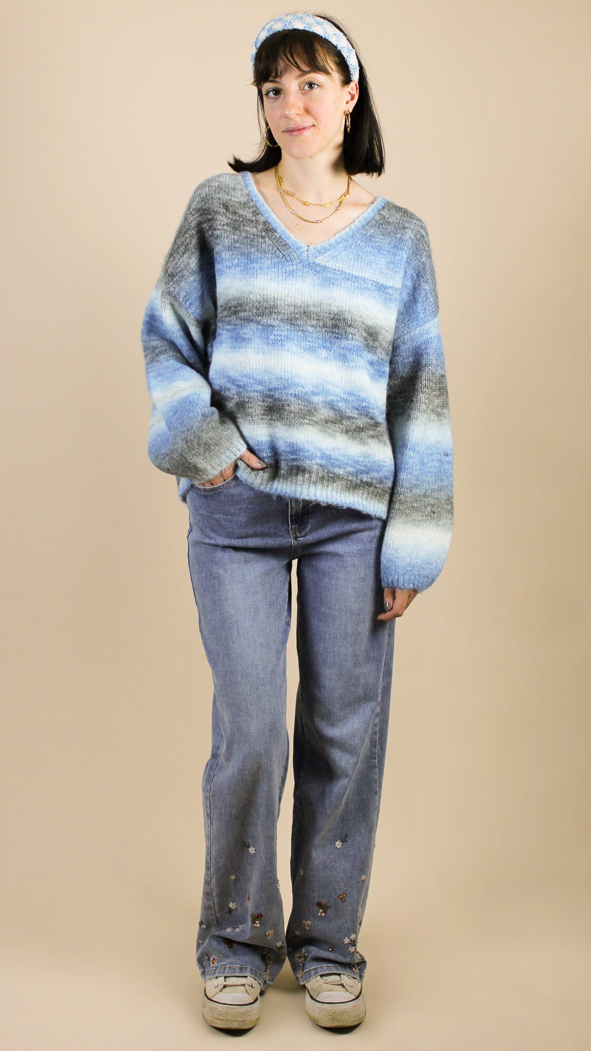 - Pull à col en V, à manches longues.